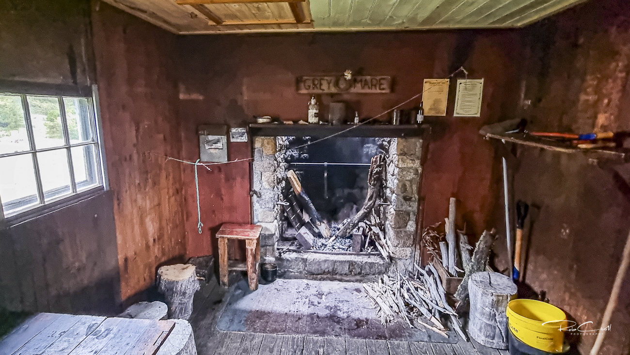 Grey Mare Hut is a single-room structure with corrugated iron walls and roof, a timber floor, and a stone fireplace. It includes five bunks and ample space for gear storage. The hut’s design is utilitarian, reflecting its mining origins and alpine function.