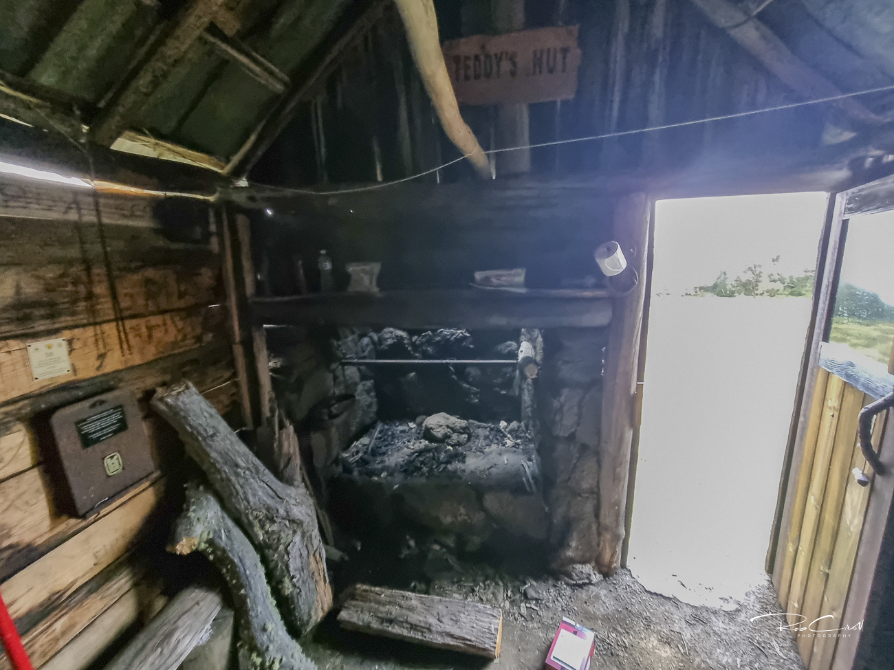Teddys Hut measures approximately 2.8m × 4m and is built of mountain ash slabs with a corrugated iron roof. It features a stone fireplace, earthen floor, and a timber-framed iron chimney. The structure is simple and sturdy, with no internal lining or amenities.