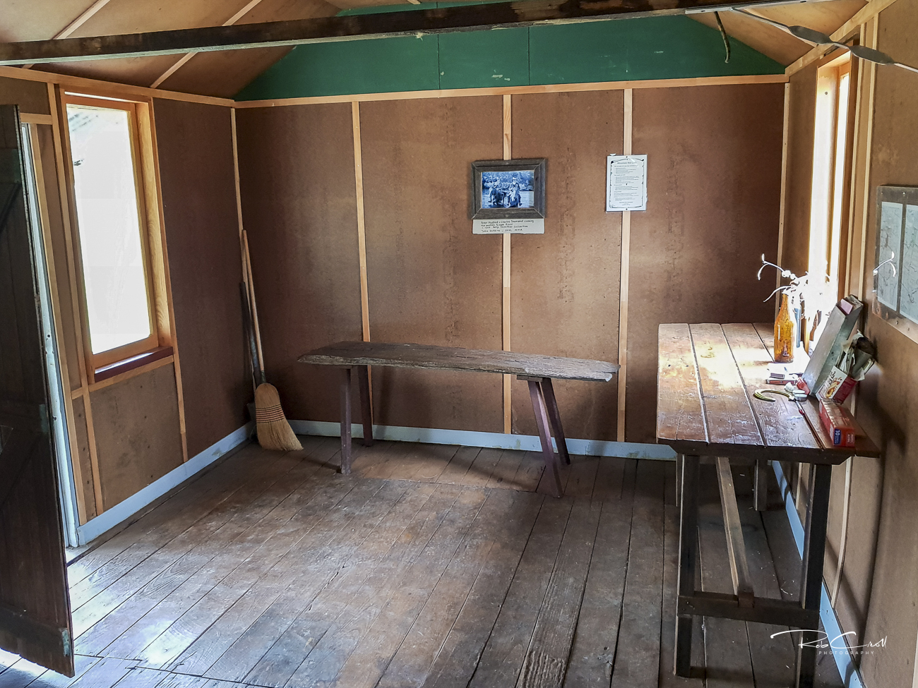 The hut is dry and weatherproof, with basic furnishings and a gambrel still hanging on the wall — once used for dressing sheep.