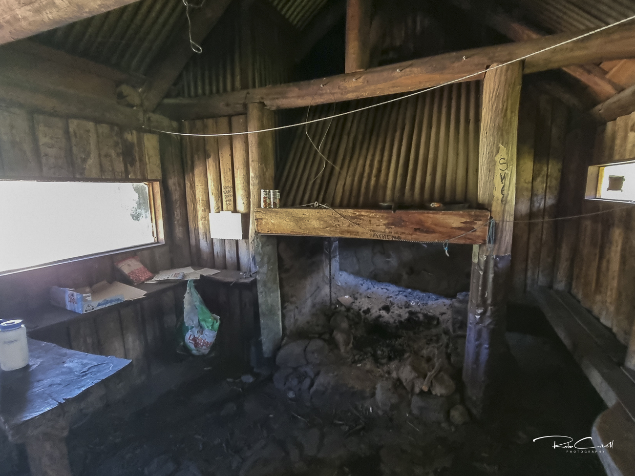 The rebuilt Bluff Hut is a timber-framed structure clad in corrugated iron, with a stone fireplace, wooden floor, and covered verandah. It includes basic furnishings and a pit toilet nearby. The hut is dry, weatherproof, and suitable for emergency shelter or day use.