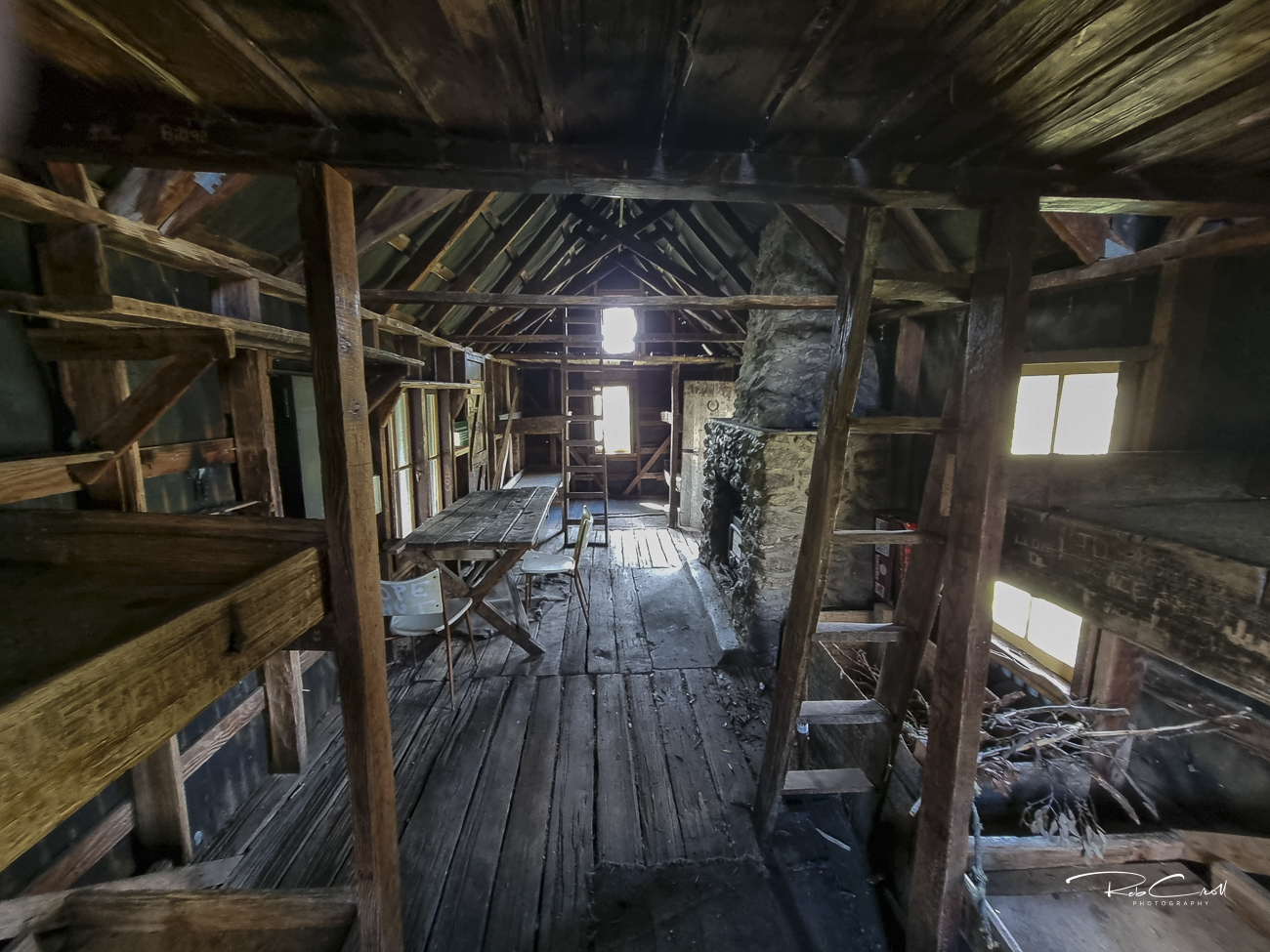 Cope Hut is a timber-framed structure clad in corrugated iron, with a pitched roof, wooden floor, and stone fireplace. It includes a small porch and basic internal furnishings. The hut is dry and weatherproof, but not intended for overnight stays except in emergencies.