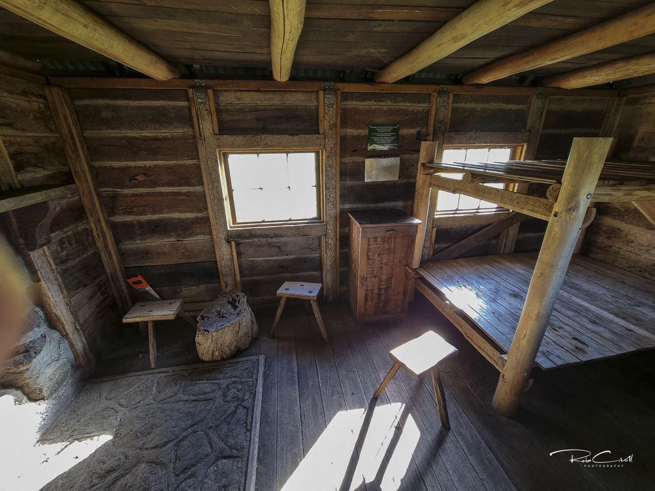 The rebuilt Fitzgerald Hut is a drop-slab timber structure with a gabled corrugated iron roof, 150mm hardwood butt-jointed floor, and basic internal furnishings. It includes bunks and a nearby toilet. The hut is dry, weatherproof, and built to last.