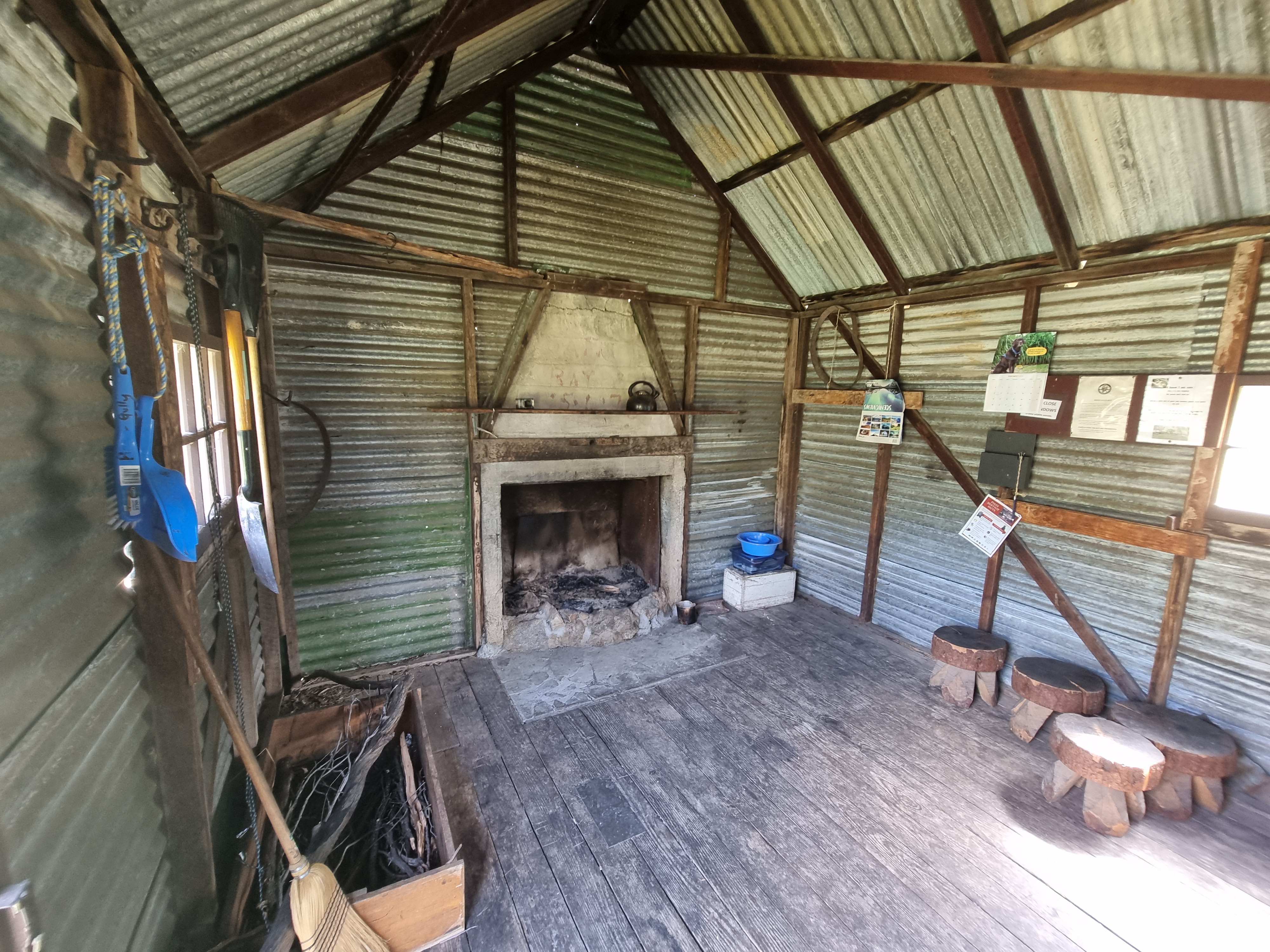The hut is built of corrugated iron over a timber frame, with a concrete fireplace and iron flue. It has a single room and no internal lining. The floor is earthen, and the structure is weatherproof but basic.