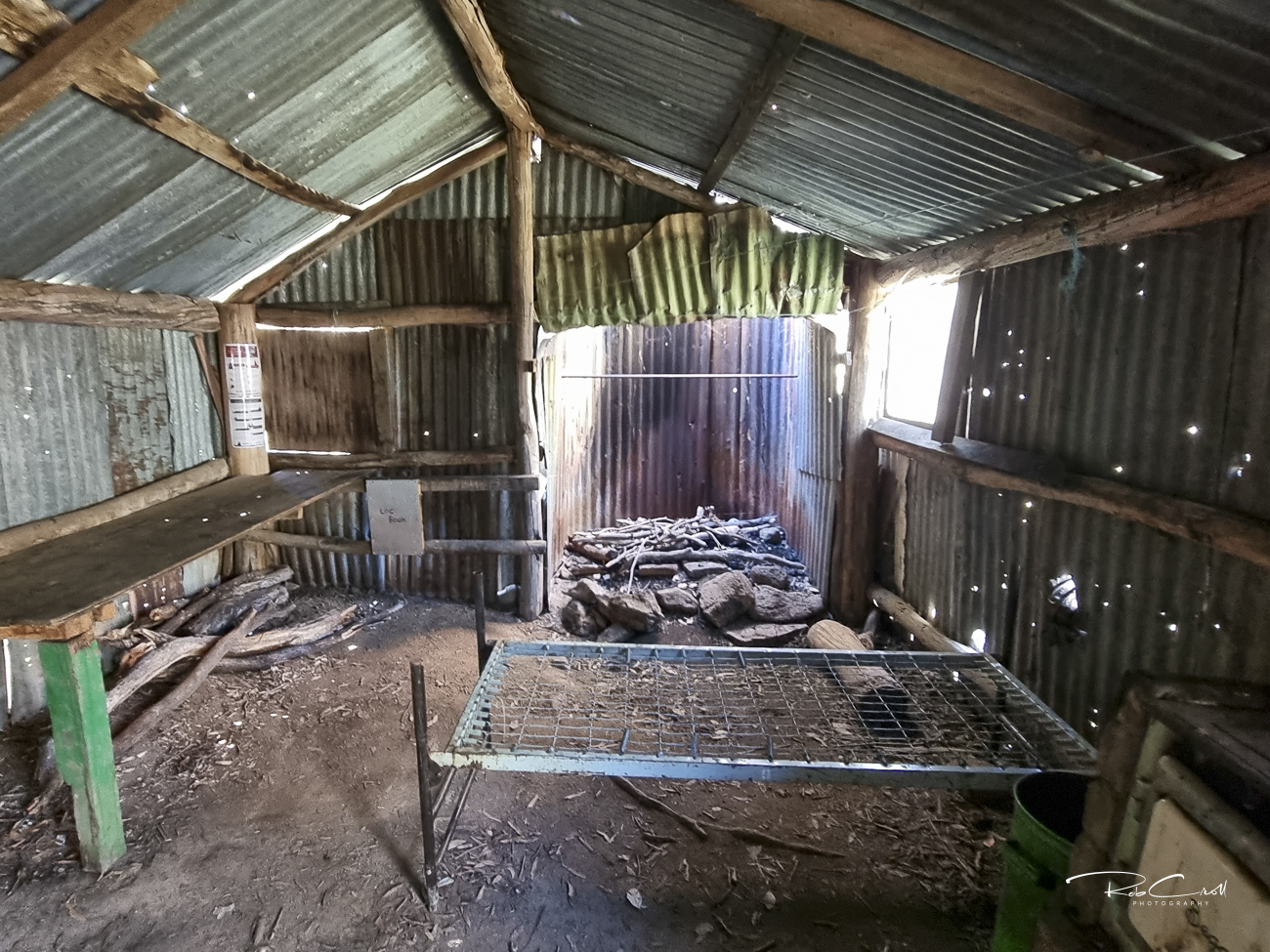 The hut is modest but practical, measuring 9 metres by 4.5 metres, and built from bush timber poles with corrugated iron walls and roof. Inside, it features two beds, a sink, and a wood-burning “Bega” stove. The fireplace has a rock and cement hearth, while the rest of the floor is dirt. There are two windows—one glazed, the other fitted with a drop-down shutter.