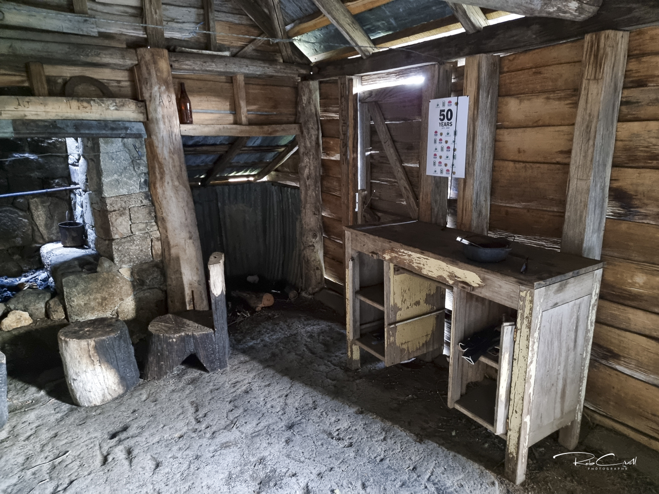 The floor is hard clay, polished smooth over time to resemble timber. Rustic furniture has been added by the Illawarra Alpine Club, the long-standing caretaker group.